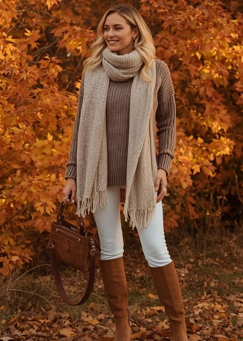 • A neutral knit sweater — cream, camel, or gray
